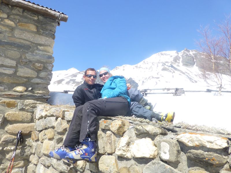 On porte environ 1km au départ de Hières et chaussons dès Valfroide (1830m) après avoir surmonté une belle coulée de printemps de plus 4m de hauteur. Ca met dans l’ambiance: autant dire que le reste du parcours est interdite à tout véhicule y compris au skidoo!