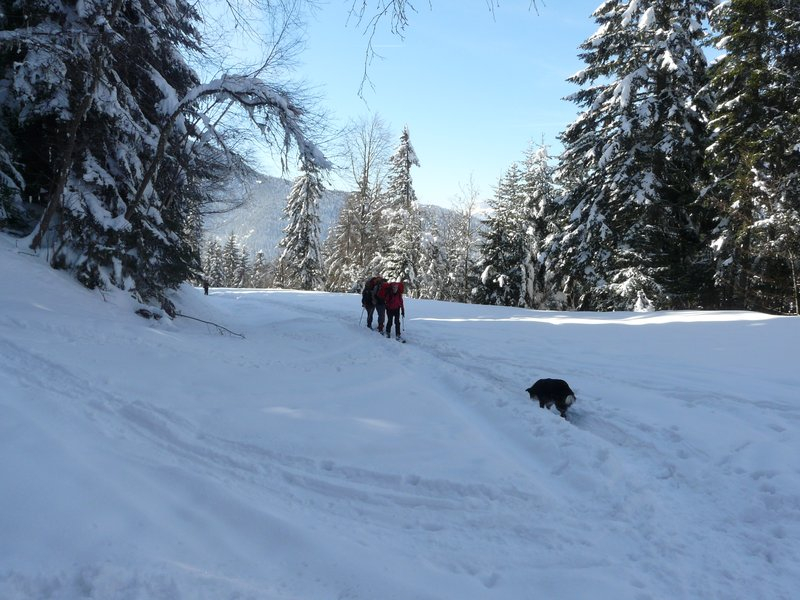 Car si nous avions dû entamer cette traversée après 2 semaines d’anticyclone, comme c’était le cas début janvier, nous n’aurions eu qu’une neige soufflée et cartonnée. Mais heureusement, 2 belles intempéries nous ont ramené de la fraîche si bien qu’au Crêt de la neige (1722m), point culminant du Haut-Jura, on a relevé en passant 1,40m de neige cumulée, soit beaucoup plus à altitude égale que dans Belledonne ou Chartreuse. Ainsi, 2h à peine après notre départ mettions nous les raquettes, et ce jusque Bellegarde où nous n’avons déchaussé qu’à 817m en versant Sud.