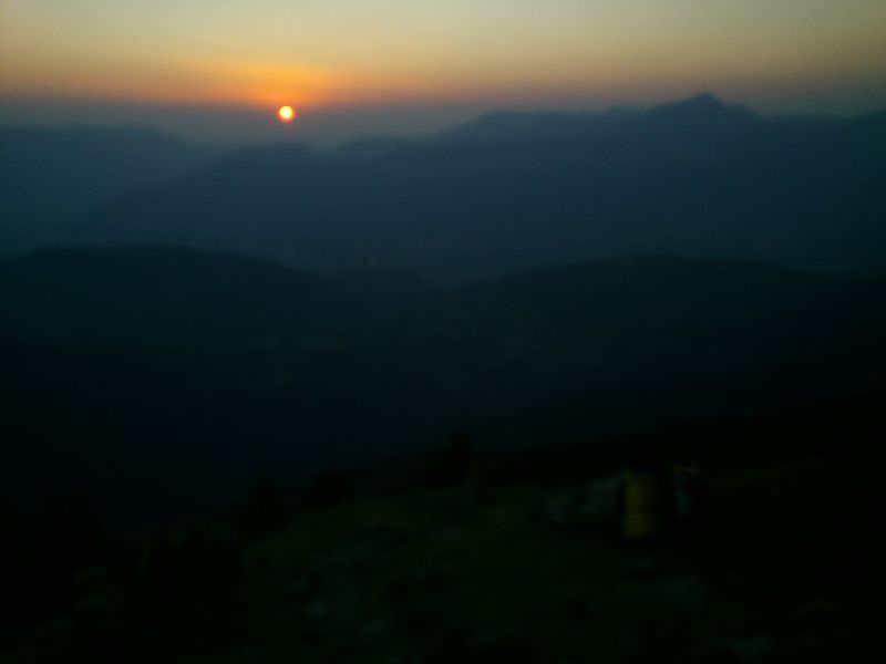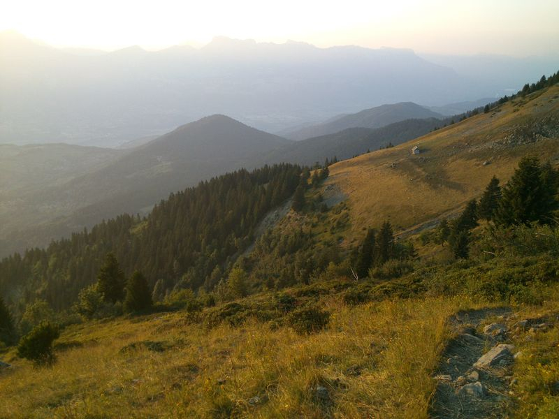 Pourtant on peut monter/descendre à la cabane en à peine 1h, je recommande ce coin à tous ceux qui souhaitent s’échapper dans les alpages l’espace d’un soir. La vue est imprenable à la fois sur tout le massif de la Chartreuse et du Vercors. Pour le bivouak lui-même, à part la cabane et à moins de monter 200m-300m au dessus sur un replat de la crête, il n’y a quasiment aucune zone plane. J’ai donc posé mon duvet juste devant la cabane sur la petite aire plane dépourvue d’herbe :O( après avoir fait le plein pour la nuit à la source à côté. Belle nuit, juste un peu de vent sur la fin, demi-lune, beau ciel étoilé et encore un beau point de vue sur les lumières de Grenoble. Cependant je me demande si on pourrait pas faire autrement que de laisser les lumières des villes allumées toute la nuit. Quel gaspillage à l’échelle de la planète quand 80% des gens dorment! Et nous aussi pour photographier le ciel on s’en passerait bien aussi.