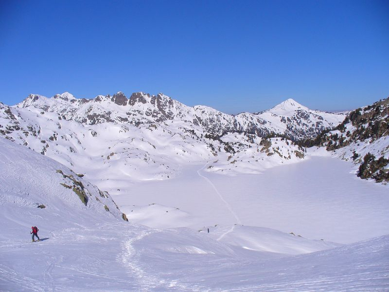 Superbe descente (photo de droite) jusqu’en bas de la Combe des Platières, remontée sous la Pointe du Mont du Fût et 2ème descente sous les Monts. Remontée jusqu’au collu des Monts (2389m) et dernière descente quasi tout en poudre jusqu’au hameau de la Sauce.