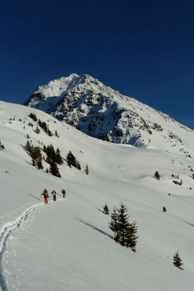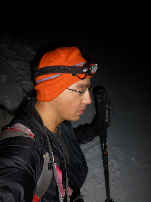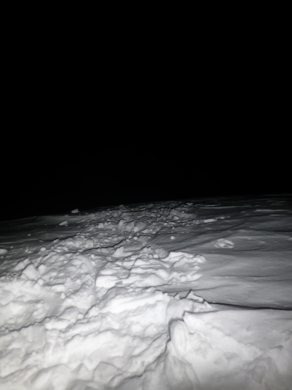 Malgré le crépuscule, je prends la direction de la Petite Moucherolle. Le sommet n’est pas très difficile à skier mais tout de même un peu étroit sur la fin, d’autant que comme souvent l’approche de la crête est croûtée et gelée. Les corniches au loin sont énormes, je prends au moins 6m de marge me fiant à d’anciennes traces de raquetteux, ça donne une idée de comment a soufflé le vent dans le coin et c’est sûr que ça circule sur les crêtes Est.