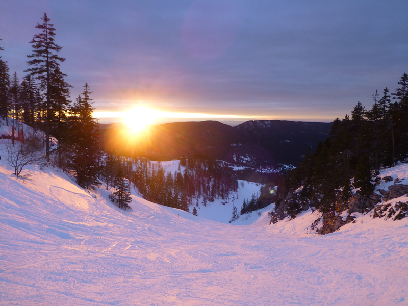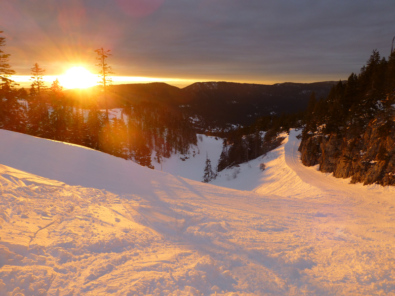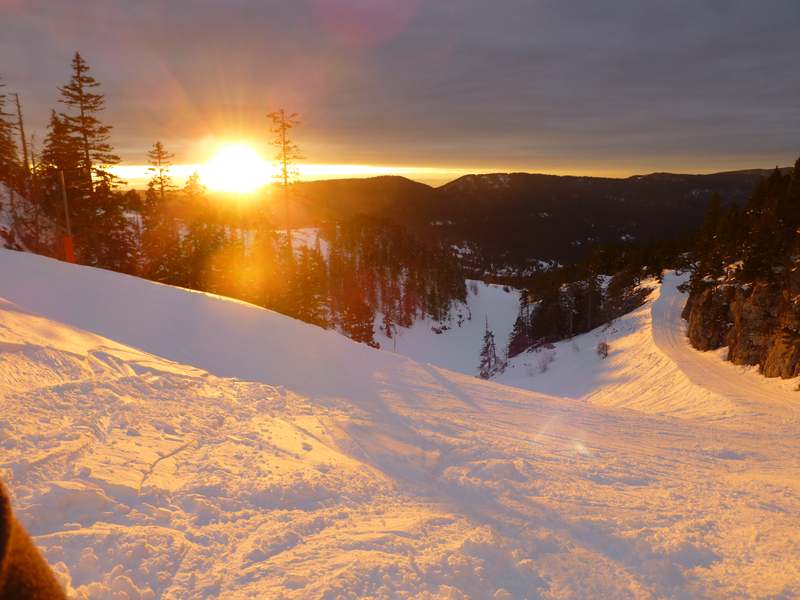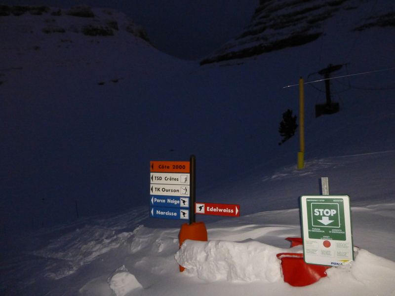 C’est pas la première fois qu’on monte là-haut (j’y étais notamment déjà allé avec Cyp, Rémi et Michel), mais jamais je n’y étais resté bivouaker. Bien que le soleil soit un peu plus voilé que prévu, les conditions sont clémentes en cette fin d’après-midi: il ne fait pas trop froid et surtout aucun vent sur les crêtes. Arrivé sous les crêtes en remontant la piste noire de Rhodos du domaine de Corrençon, le soleil me gratifie d’un magnifique couché aux couleurs surréalistes.