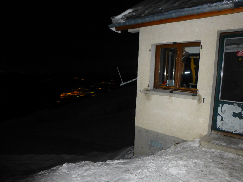 Le ciel a le bon goût de se dégager un peu avec la Lune naissante si bien que lorsque j’arrive à la cabane de secours, j’y vois mieux qu’en montant. Dommage que je n’ai plus mon vieux bridge, impossible de régler le temps pose et de faire des beaux clichés. Néanmoins tout est dégagé alentour et les falaises de la Grande Moucherolle sont époustouflantes jusqu’au Grand Veymont. Je crois que c’est la première fois que je les aperçois aussi bien de nuit.